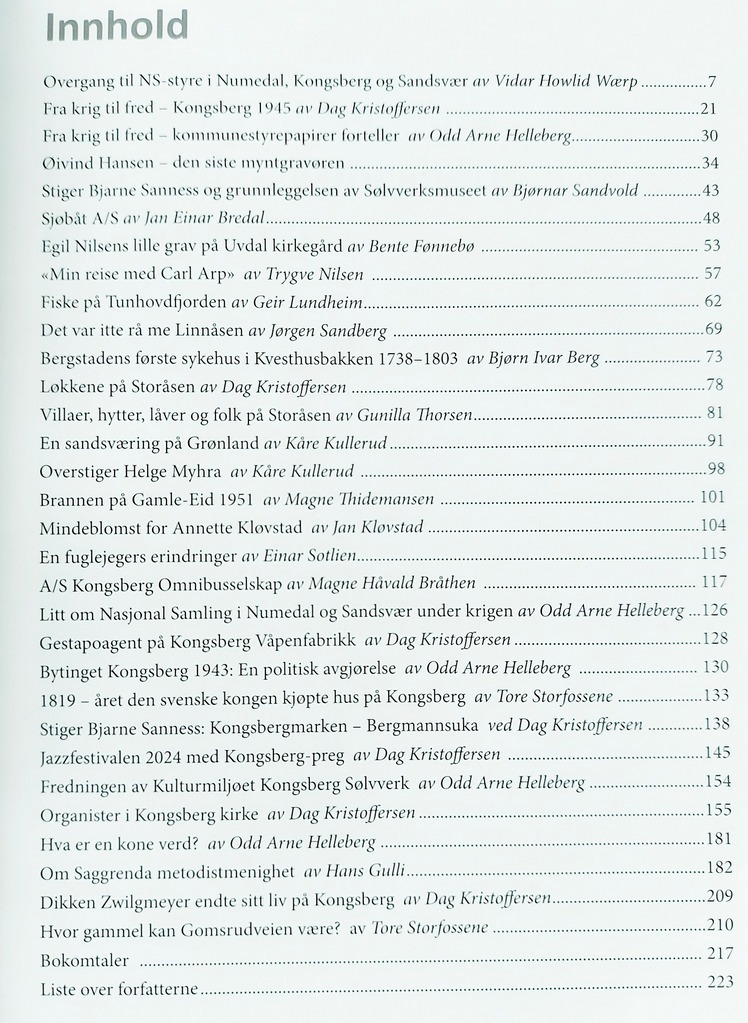 Siden det er 80 år siden krigen slutta, er det flere artikler om den. Det fortelles om organister i Kongsberg kirke, jazzmusikere fra Kongsberg, Kongsberg Omnibusselskap, Bjarne Sanness som grunnla bergverksmuseet og hadde store planer om bergmannsuke, løkkene på Storåsen og selvsagt mye mer. Se innholdsfortegnelsen.