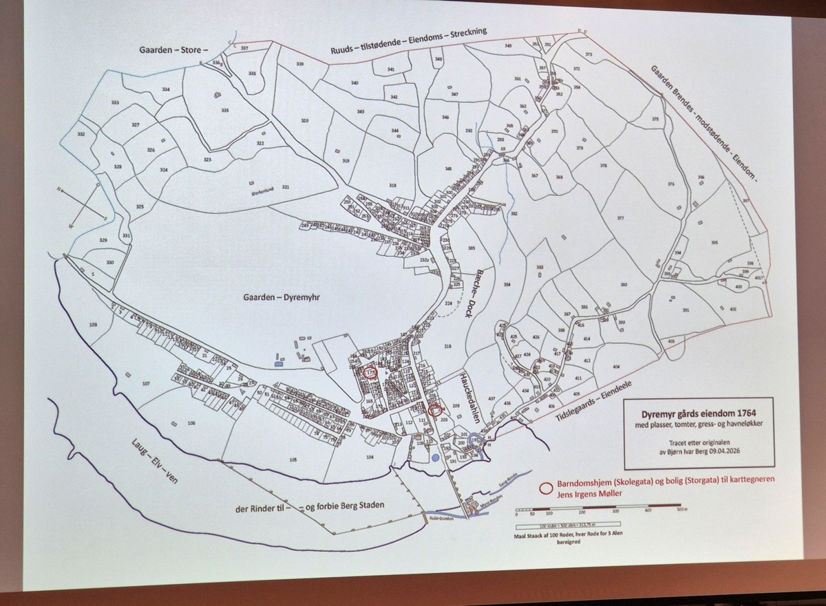 Han har tatt utgangspunkt i et kart fra 1764 over alle løkkene under Dyremyr gård. Her er 444 eiendommer beskrevet med eier, lengde og bredde.